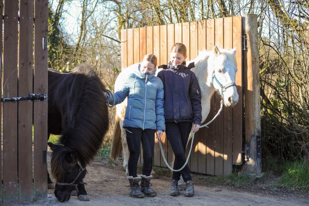 Die Schüler kümmern sich unter Aufsicht selbst um die Pferde vor und nach dem Reiten. Dies fördert den respektvollen Umgang und stärkt das Vertrauen zwischen Reiter und Pferd.